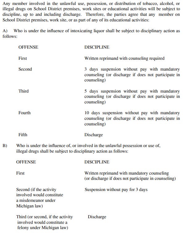 The contract specifies a progressive disciplinary system for alcohol-related misconduct. A teacher under the influence of alcohol at school receives the following penalties: